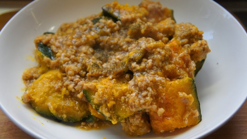 今回ご紹介するレシピは、カボチャとひき肉を甘辛く煮て水溶き片栗粉でトロミをつける「カボチャのそぼろ煮」です。